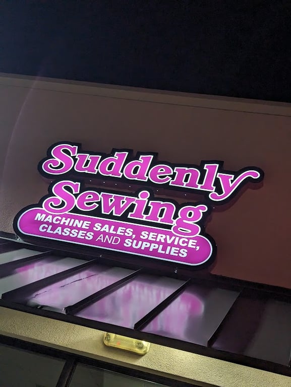 A brightly lit sign for Suddenly Sewing displays the store's name and services, including machine sales, service, classes, and supplies, inviting customers into a vibrant sewing