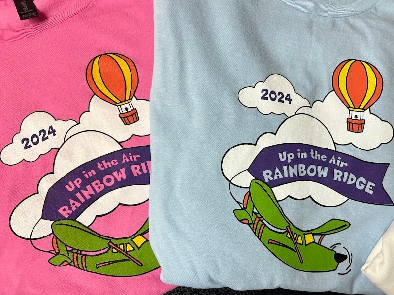Two colorful t-shirts are displayed side by side, one pink and one light blue, featuring playful graphics of hot air balloons and an airplane.