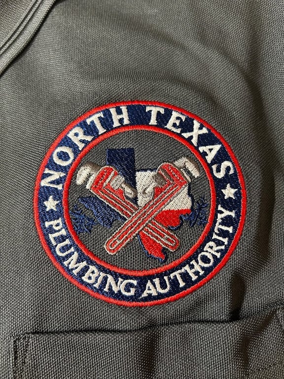 A detailed embroidered patch features the text "North Texas Plumbing Authority" encircled by a red border.