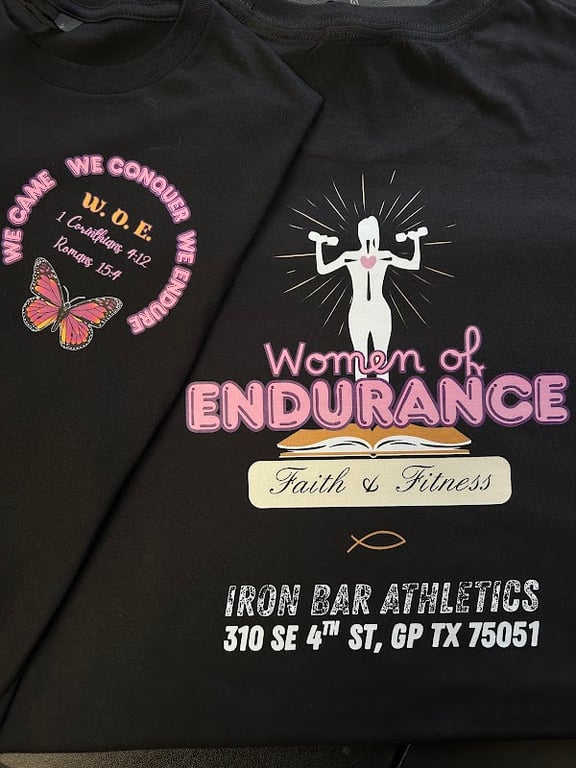 Two black t-shirts feature vibrant graphics promoting "Women of Endurance," showcasing a strong figure and a butterfly.