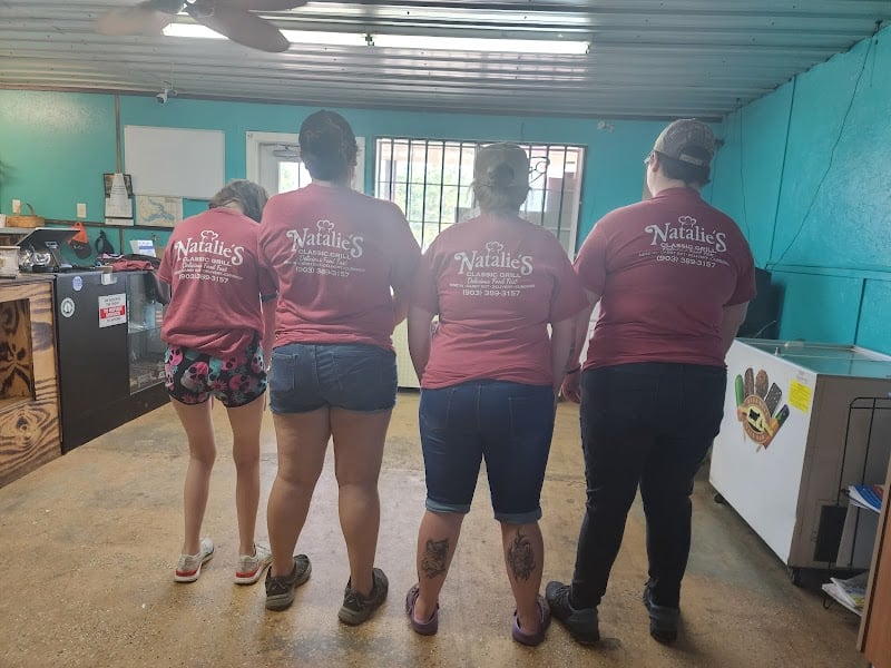 Four individuals stand with their backs to the camera, wearing matching red shirts with "Natalie's" printed on them.