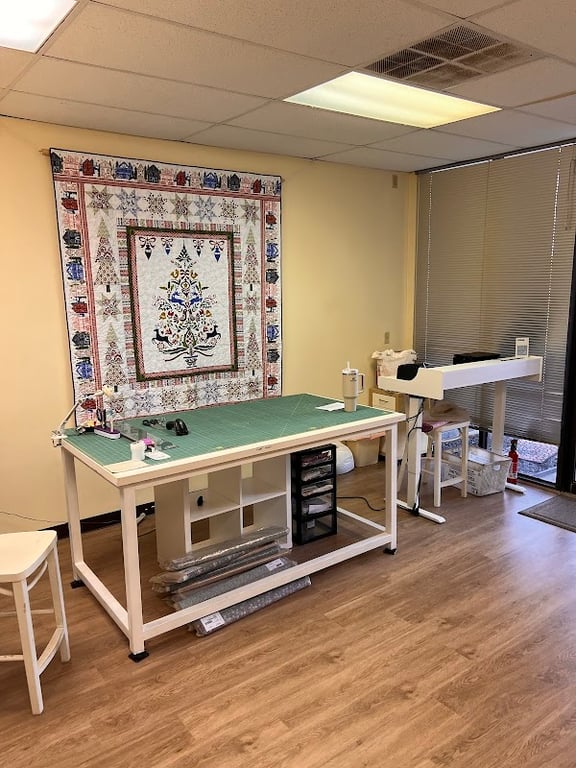 The image shows a sewing workspace at Buttons 'n' Bows Fabrics, featuring a large cutting table with a green mat, storage drawers, and a colorful quilt hanging on the wall.
