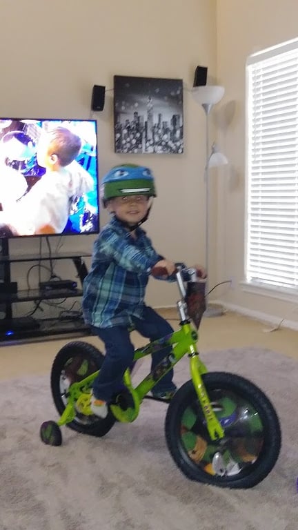 A young child rides a green bicycle while wearing a blue helmet, smiling joyfully.