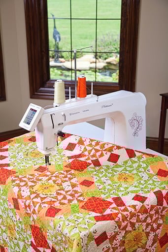 A bright sewing machine is positioned in front of a colorful quilt featuring vibrant greens, oranges, and reds.