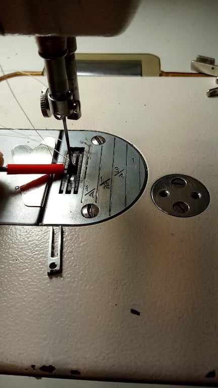 The image shows a close-up of a sewing machine's needle and presser foot, with a red tool positioned near the needle.