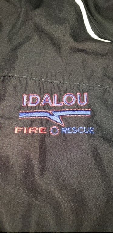 The image features a close-up of an embroidered logo on a black fabric, displaying "IDALOU FIRE RESCUE" in red and blue thread.