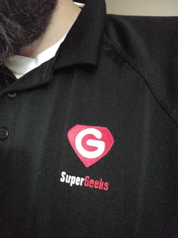 The image shows a close-up of a black polo shirt featuring a red and white logo with the letter "G" and the text "SuperGeeks.