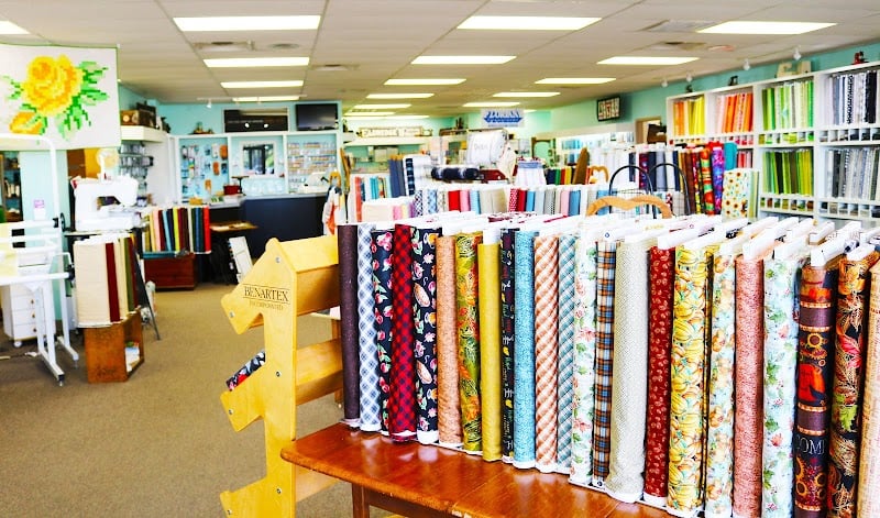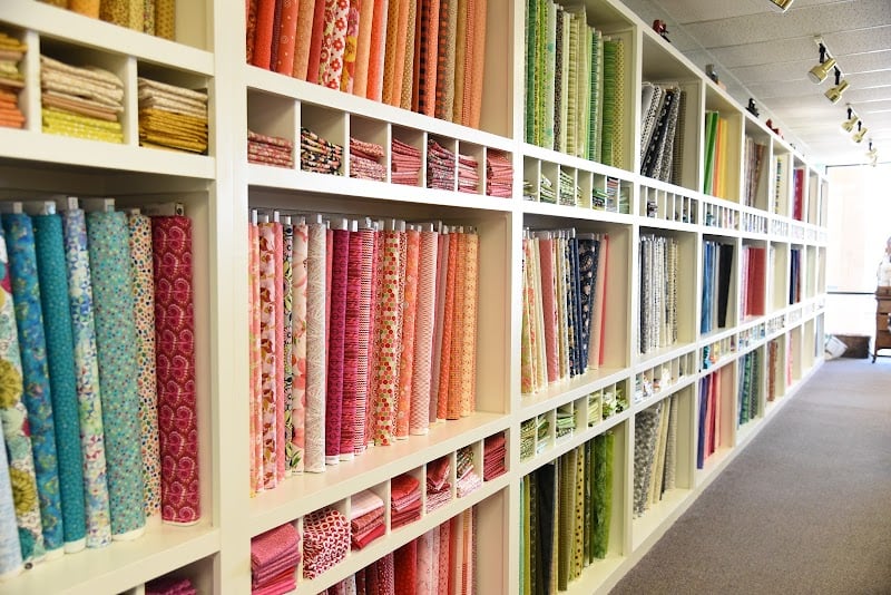 The Sewing Studio features vibrant fabrics displayed on shelves, including colorful quilt samples.