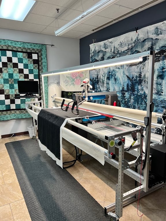 A quilting machine is prominently displayed in a well-lit sewing studio, surrounded by colorful fabric samples and a large quilt hanging on the wall.