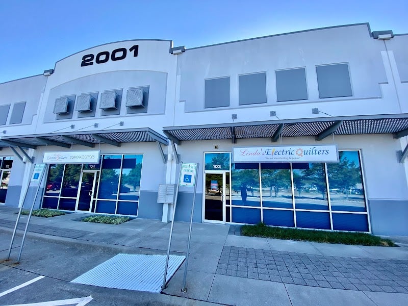 The exterior of Linda's Electric Quilters features a modern storefront with large windows displaying sewing supplies.