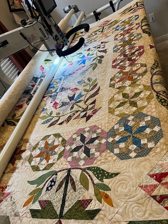 A quilting machine is positioned over a beautifully detailed quilt featuring intricate patterns and vibrant fabrics.