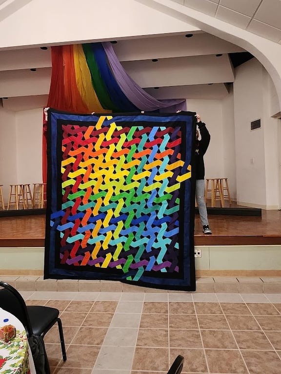 A vibrant quilt featuring a rainbow pattern is held up by a person in a black hoodie, set against a backdrop of colorful draped fabric in a spacious sewing store.