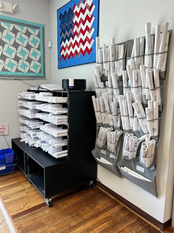 A vibrant sewing store interior features neatly organized rolls of patterns displayed on a black shelving unit and wall-mounted racks.