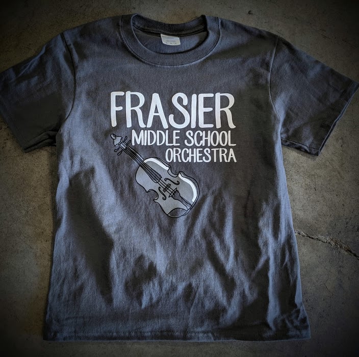 A gray t-shirt featuring the text "Frasier Middle School Orchestra" alongside a graphic of a violin is displayed on a flat surface.