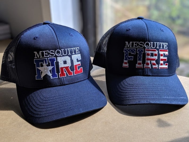 Two navy blue caps featuring the embroidered text "MESQUITE FIRE" in red, white, and blue, showcasing a patriotic design.