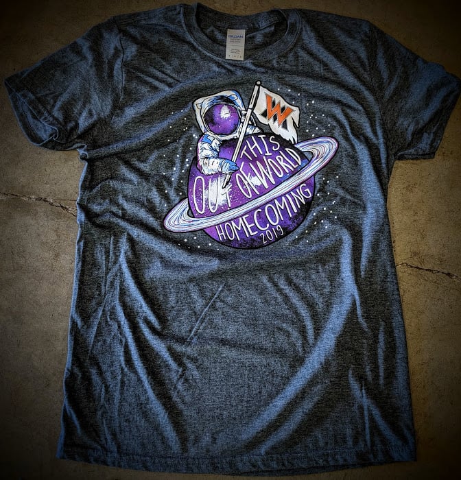 A gray T-shirt featuring a colorful graphic of an astronaut holding a flag, surrounded by planets and stars, promoting a "Homecoming 2019" event.
