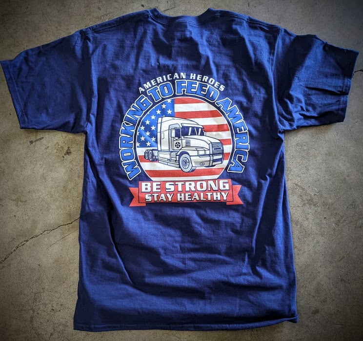 The image features a navy blue t-shirt displaying a graphic of a truck with the text "Working to Feed America" and "Be Strong Stay Healthy.