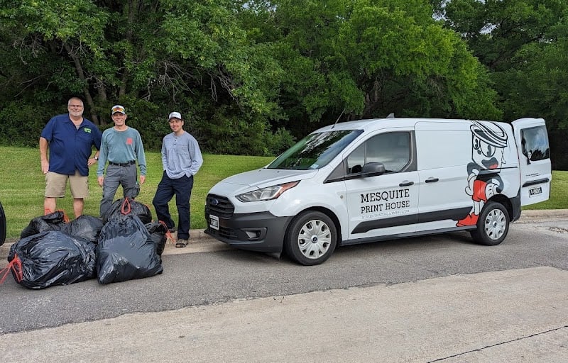Three men stand beside a Mesquite Print House van, with bags of collected items on the ground. The setting is outdoors, surrounded by greenery, highlighting community engagement.