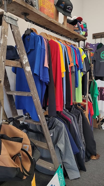 The image showcases a vibrant display of various shirts and hats hanging on wooden racks in the Mesquite Print House sewing store.