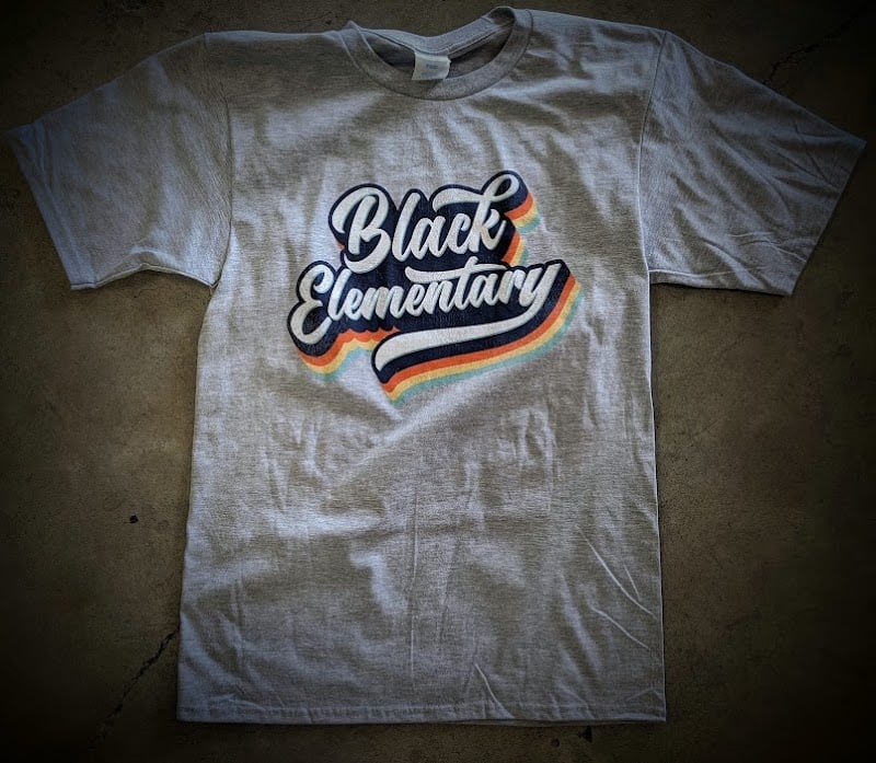 A gray t-shirt featuring the text "Black Elementary" in bold, colorful lettering is displayed on a flat surface.