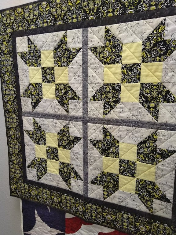 The image showcases a beautifully crafted quilt featuring a star pattern in black, yellow, and gray fabrics.