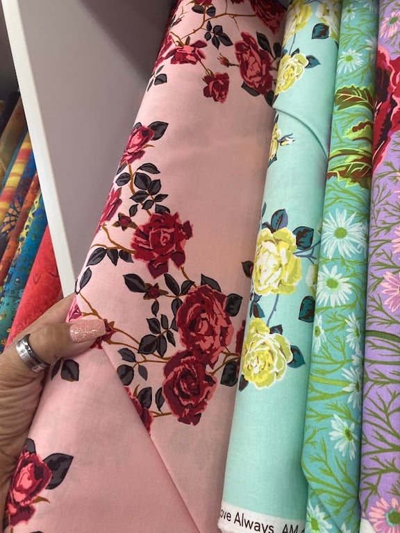 A hand holds a roll of pink fabric adorned with red roses, surrounded by vibrant fabrics in various colors and patterns.