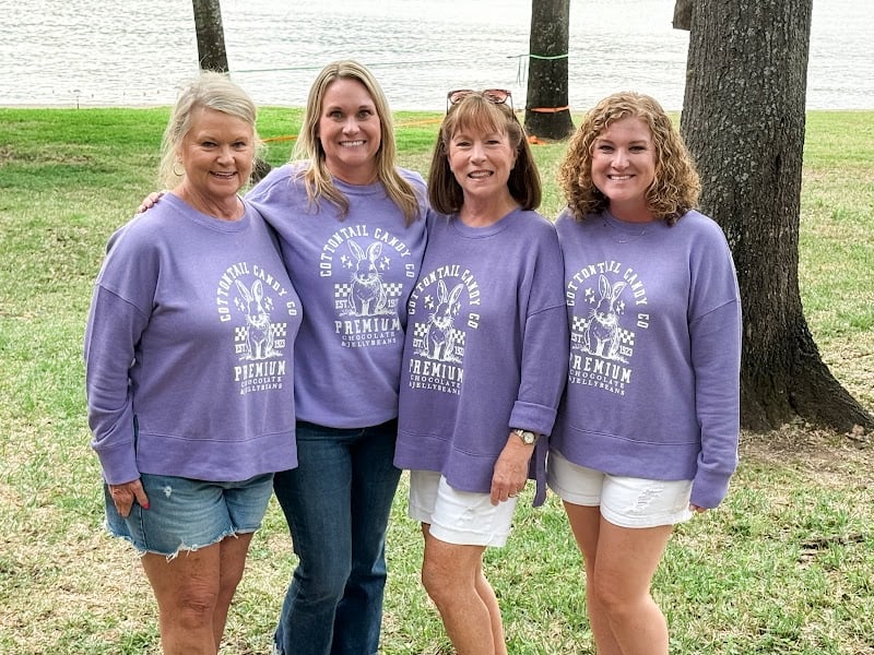 The image shows four women wearing matching purple sweatshirts, standing together outdoors by a grassy area near a body of water.