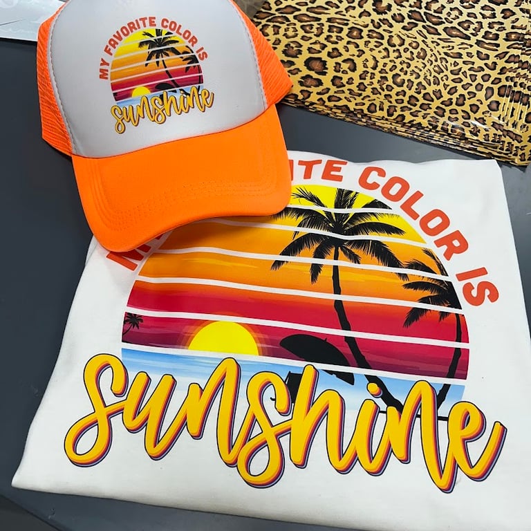 The image features a vibrant orange cap and a white t-shirt with a colorful sunset design and the phrase "My Favorite Color is Sunshine.