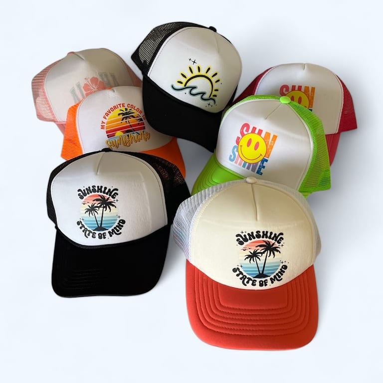A colorful assortment of trucker hats is displayed, featuring vibrant designs like sun motifs and tropical themes.