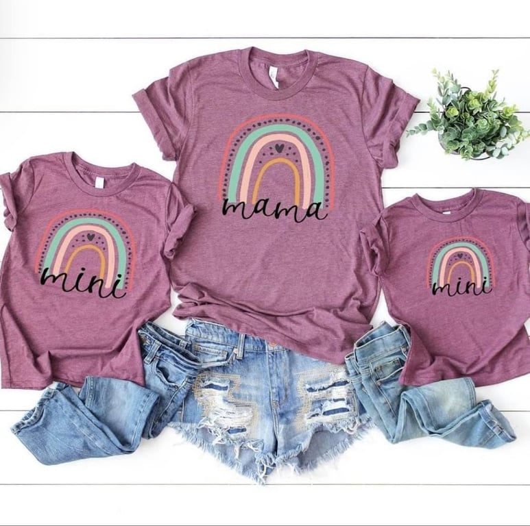 The image features matching "Mama" and "Mini" t-shirts in a soft purple hue, adorned with colorful rainbow designs.