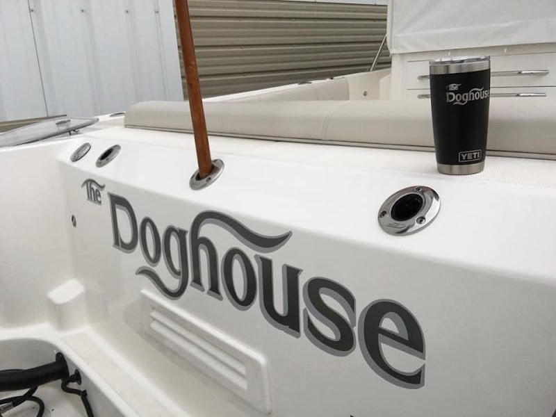 The image shows a sleek boat with the name "The Doghouse" prominently displayed on its side. A YETI tumbler rests on the surface, adding a touch of leisure to the nautical setting.