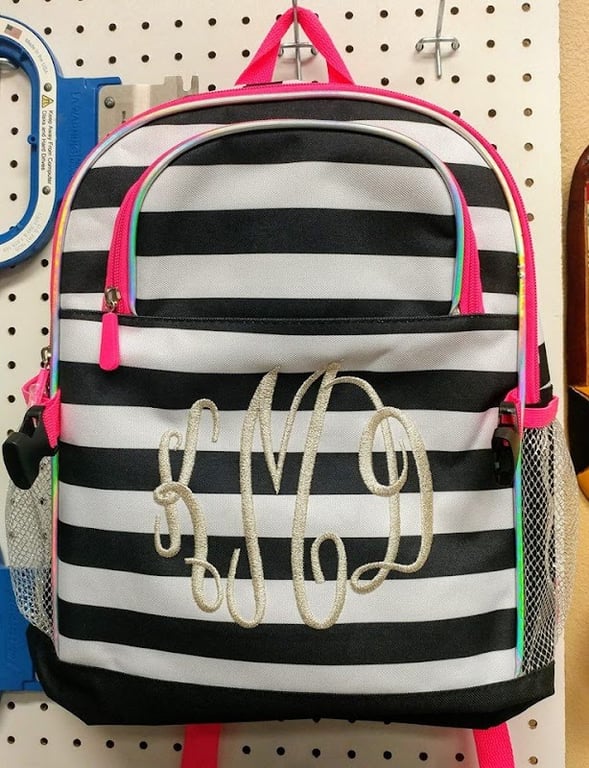 A stylish black and white striped backpack with pink accents is displayed on a pegboard.