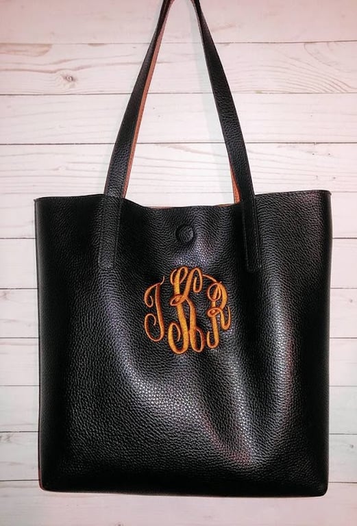 A stylish black tote bag with a monogrammed design in orange is displayed against a light wooden background. The bag showcases quality craftsmanship, ideal for sewing enthusiasts.