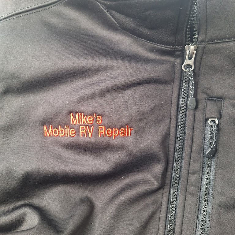 The image features a close-up of a black jacket with red embroidery that reads "Mike's Mobile RV Repair.