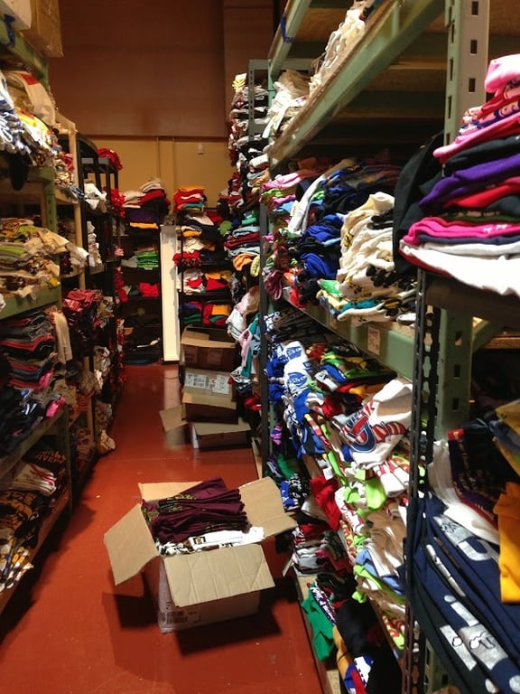 The image shows a cluttered aisle in a sewing store, filled with shelves stacked high with colorful folded fabrics and t-shirts.