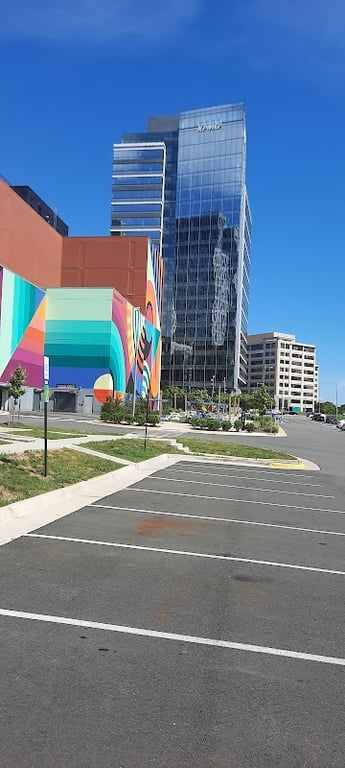 The image shows a vibrant urban scene featuring a colorful mural on a building's exterior. The setting includes modern architecture with glass facades and a spacious parking area.