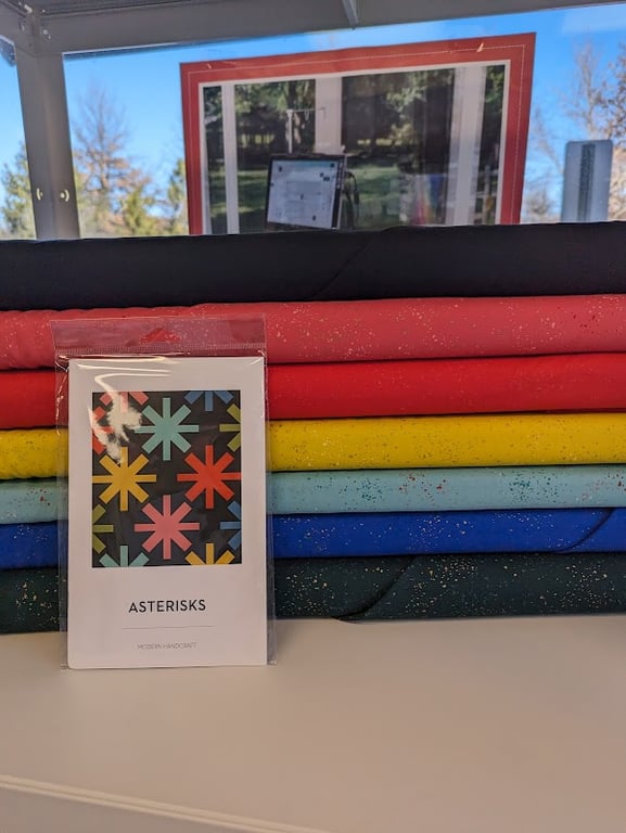 The image showcases a vibrant display of colorful fabrics stacked neatly in a sewing store, with shades of red, yellow, blue, and black.