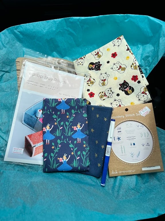 The image features a collection of colorful fabrics, including floral and cat-themed prints, alongside a sewing pattern for a pop-up tray pouch and an embroidery stitch guide.