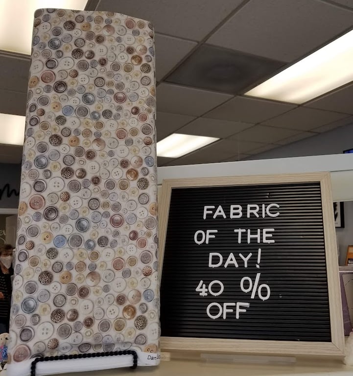 The image features a display at Sew Easy Sewing, LLC, showcasing a fabric roll adorned with a button pattern. A sign announces a "Fabric of the Day" promotion with a 40% discount.