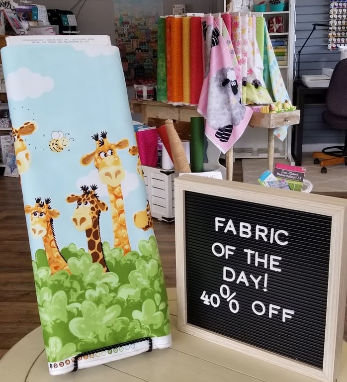 The image showcases a vibrant sewing store interior featuring a roll of giraffe-patterned fabric prominently displayed.