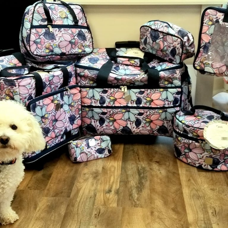 The image features a variety of floral-patterned sewing bags and storage containers displayed on a wooden floor.