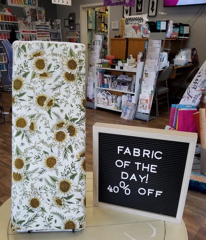 The image showcases a sewing store interior featuring a floral fabric display with sunflowers, alongside a sign announcing a 40% discount on the "Fabric of the Day.