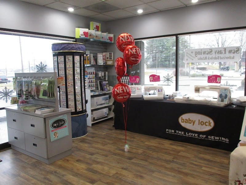 The image shows the interior of Sew Easy Sewing, LLC, featuring shelves stocked with sewing supplies, including fabric and tools.