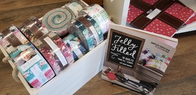 The image showcases a cozy sewing store interior featuring colorful jelly rolls of fabric neatly arranged in a wooden crate.
