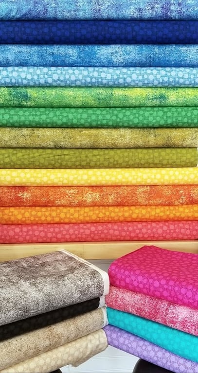 The image showcases a vibrant display of folded fabrics in various colors and patterns, arranged neatly on shelves.