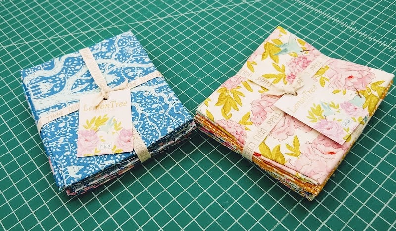 The image showcases two bundles of vibrant fabric squares from Lollies Quilt Shop, featuring floral and patterned designs.