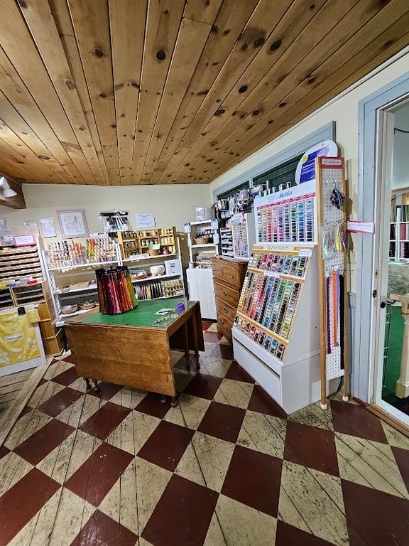 The Quiltery sewing store features shelves filled with colorful threads, fabrics, and various sewing supplies.