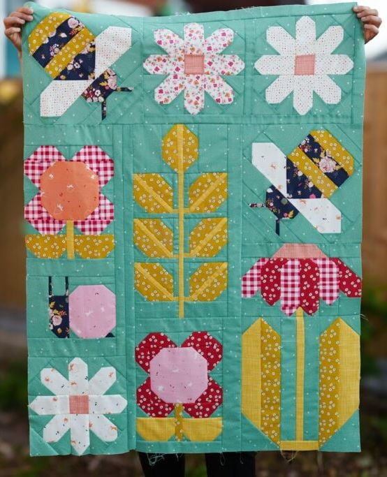 A person holds a vibrant quilt featuring colorful floral and bee patterns on a teal background.