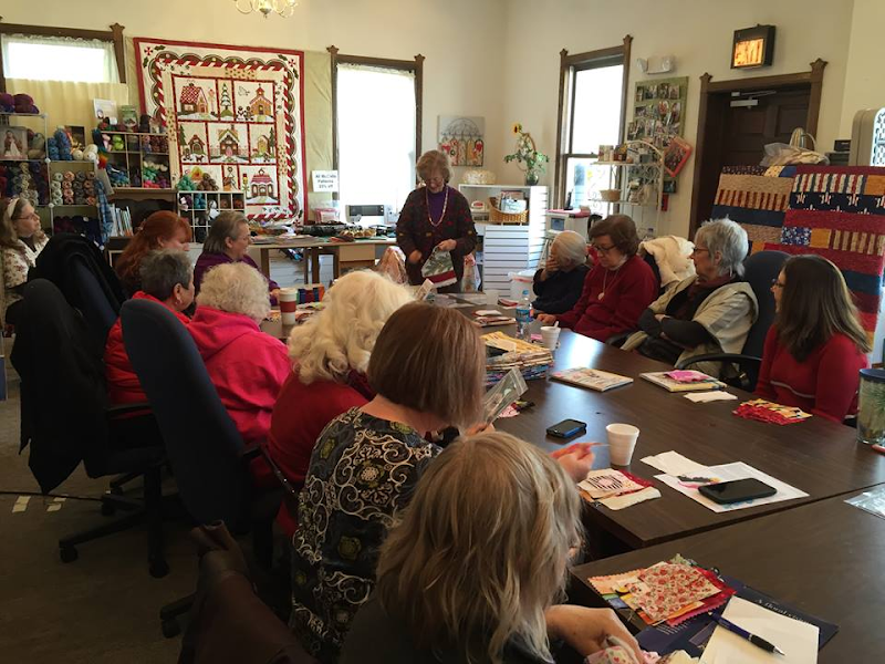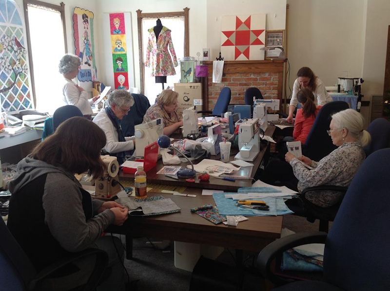 The image shows a cozy sewing store interior with a group of engaged participants seated around a table.