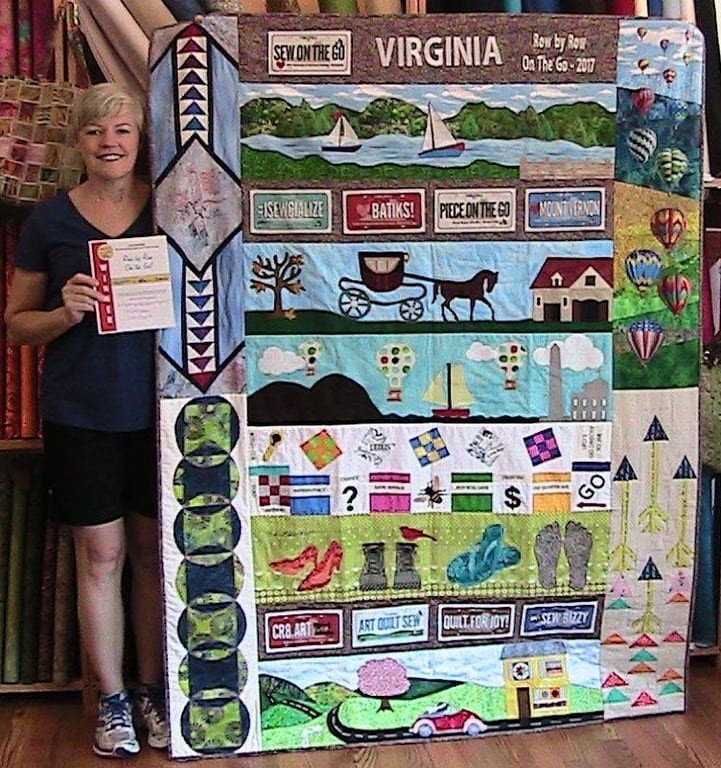 A smiling woman stands beside a colorful quilt display featuring various sewing-themed patches and designs.